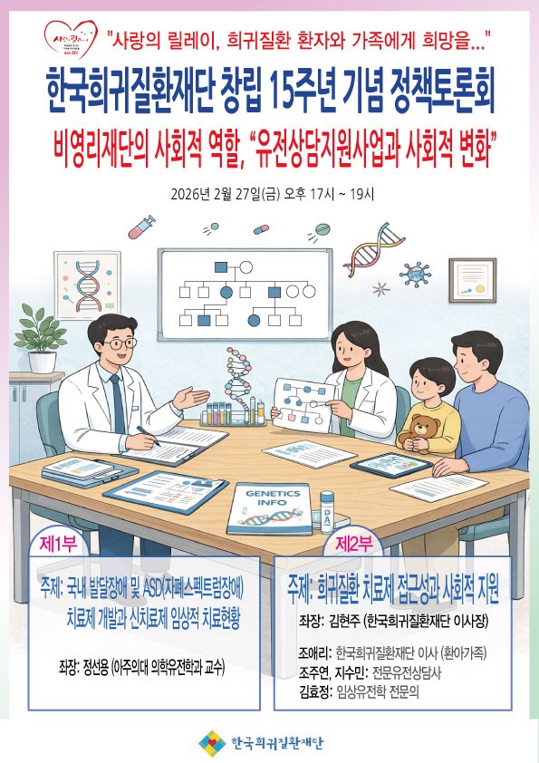 Ⅲ. 오는 2월 27일, 국회서 열리는 정책토론회: ‘마지막 퍼즐’을 맞추다 이번 정책토론회는 재단 이사진과 각계 전문가들이 참여하여 유전상담의 사회적 변화와 제도적 안착을 심도 있게 논의한다. 제1부 주제발표: 신현호 법률사무소 해울 대표 변호사가 ‘한국희귀질환재단 15년의 발자취와 향후 방향’을 조명하며 법적·사회적 관점에서의 비영리재단 역할을 강조한다. 이어 아주대 의대 정선용 교수가 ‘유전상담 서비스와 진단 유전자검사의 현황’을 발표하며, 최신 유전체 기술이 임상 현장에서 유전상담과 어떻게 결합되어야 하는지 학술적 근거를 제시한다. 특히 실제 근육장애인 부모와 인증 유전상담사가 직접 연자로 나서 현장의 생생한 고충과 필요성을 전달할 예정이다. 제2부 패널토론: 김현주 이사장을 좌장으로 하여 보건복지부, 국회 입법조사처, 저출산고령사회위원회 관계자들이 머리를 맞댄다. 여기서 주목할 점은 유전상담을 단순한 복지 차원이 아닌 ‘국가적 인구 정책’의 일환으로 다룬다는 것이다. 희귀질환 가계의 비장애 성인 가족들이 유전적 불안감을 해소하고 정상적인 출산을 결심할 수 있도록 돕는 유전상담은, 초저출산 시대에 건강한 사회를 유지하기 위한 핵심 열쇠가 될 수 있다. .jpg)